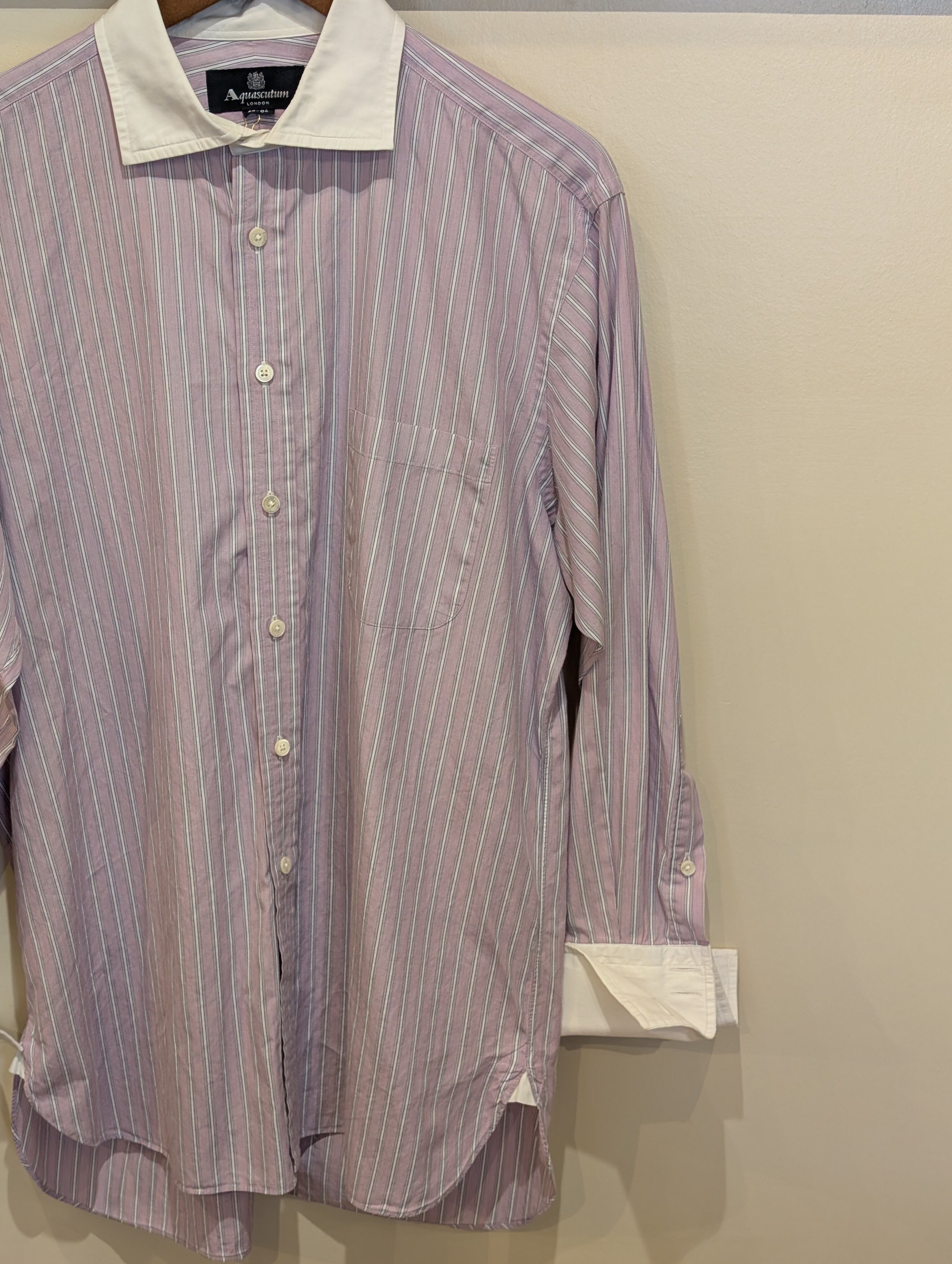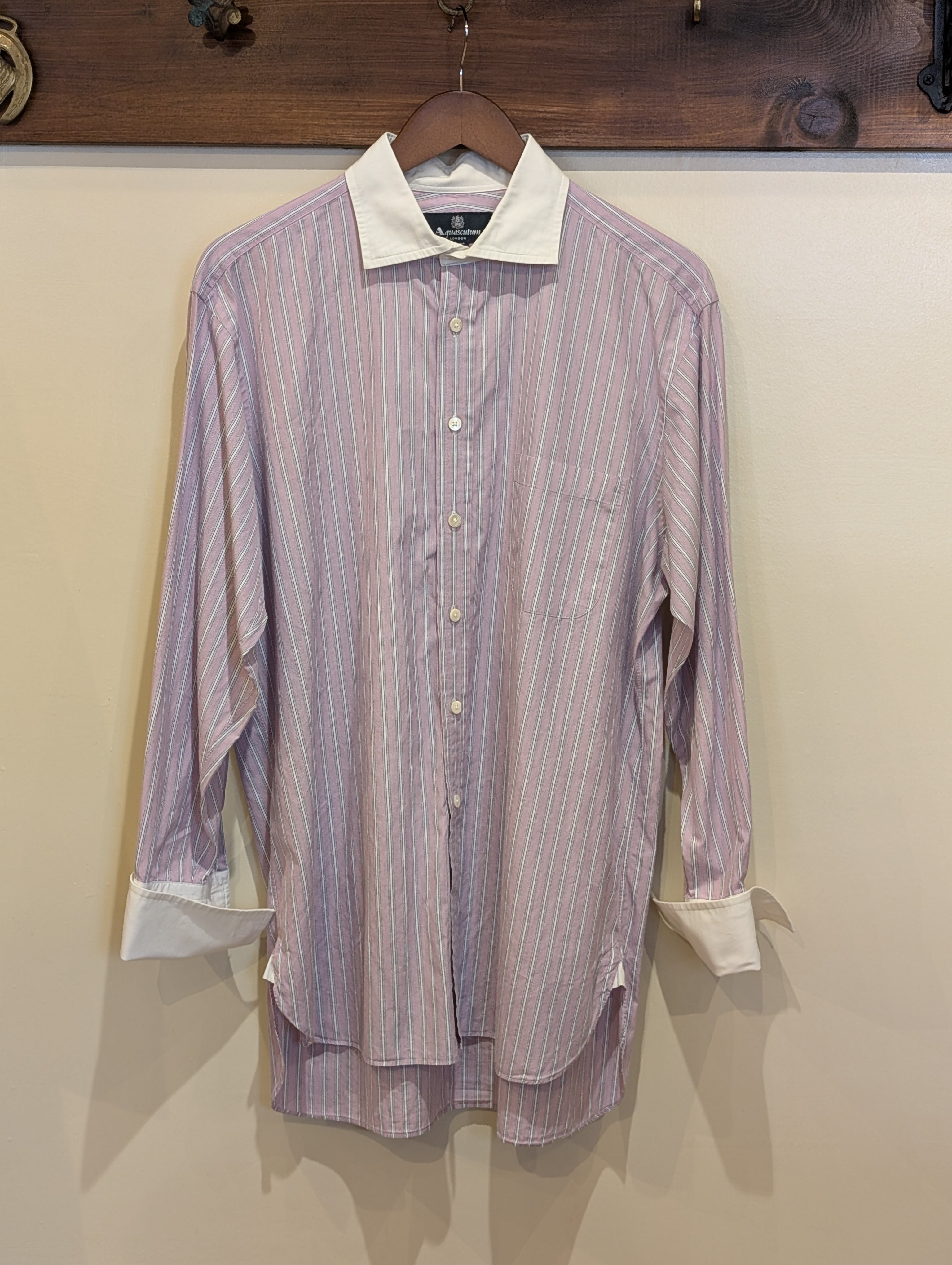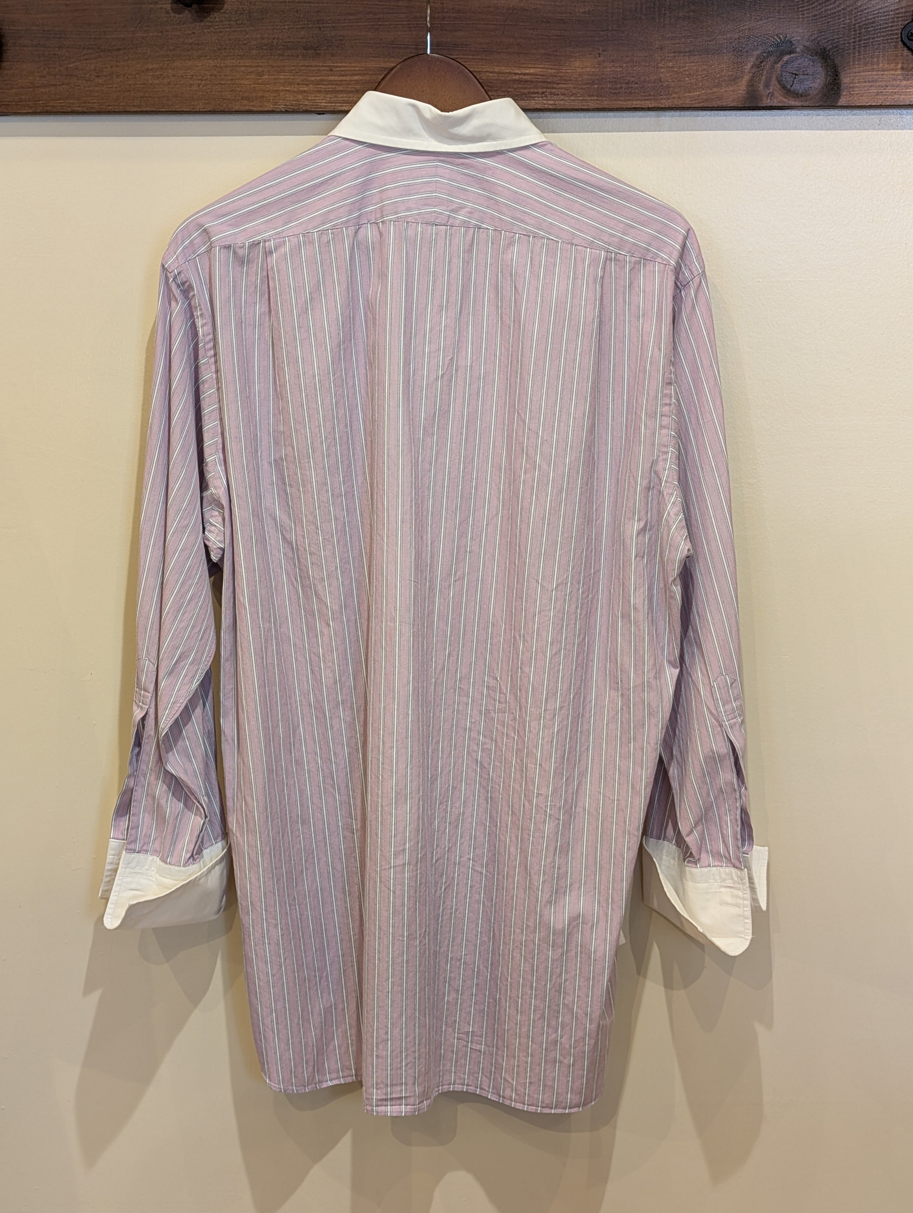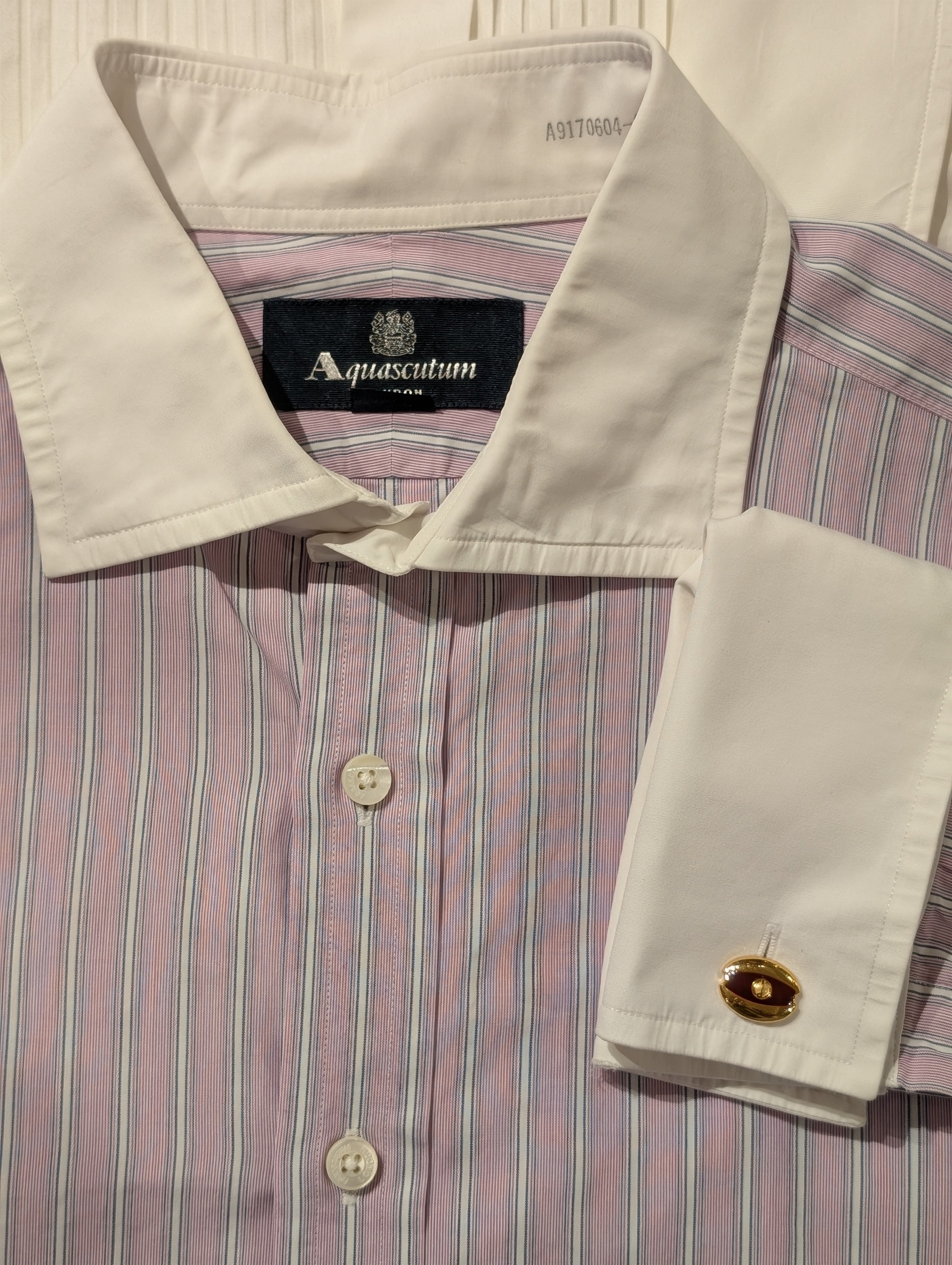 シャツの袖口を二重に折り返して、カフスボタンで留めるタイプのシャツのご紹介です。