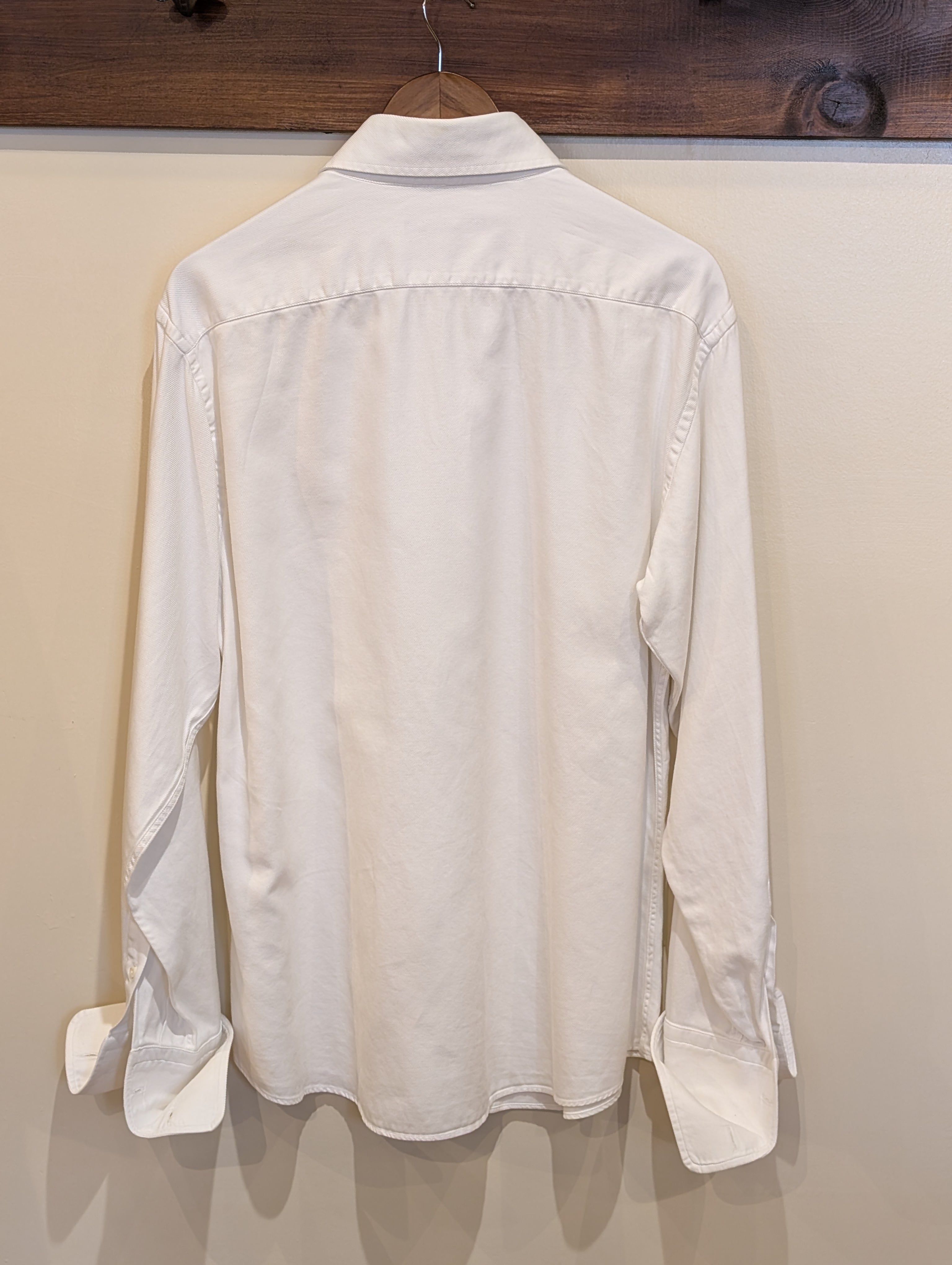 シャツの袖口を二重に折り返して、カフスボタンで留めるタイプのシャツのご紹介です。